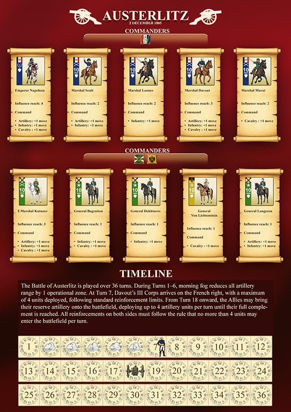 The Battle of Austerlitz brings the legendary clash of the Three Emperors to the Marshals Unleashed system with a massive, high-resolution print-and-play battle map. To play this grand scenario, you will need the French, Austrian, and Russian nation armies.
