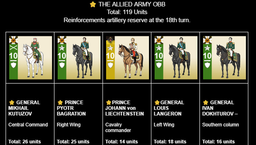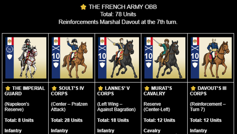 This release also adds new commanders; Murat, Lannes, Davout, Soult, Bagration, Langeron, and Dokhturov along with a complete order of battle, command charts, a 36-turn timeline, and scenario icons. Prepare your armies and relive Napoleon’s greatest victory as the Sun of Austerlitz rises once more.